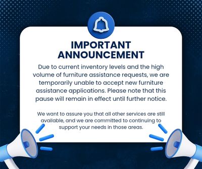 As of October 26, 2025, we are currently serving the furniture applicants we have been in contact with and will be using a wait list process as inventory becomes available.